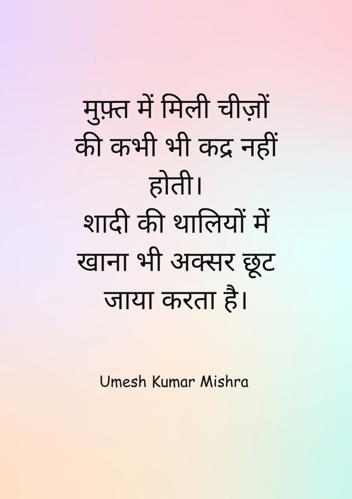 मुफ़्त में मिले ज्ञान को लोग उपदेश समझते हैं और उपदेश अक्सर भुला दिए जाते है।लेकिन वही ज्ञान जब पैसों से खरीदा जाए तो इन्सान उसे ज़िंदगी भर याद रखने की कोशिश करता है।